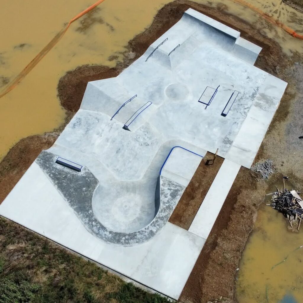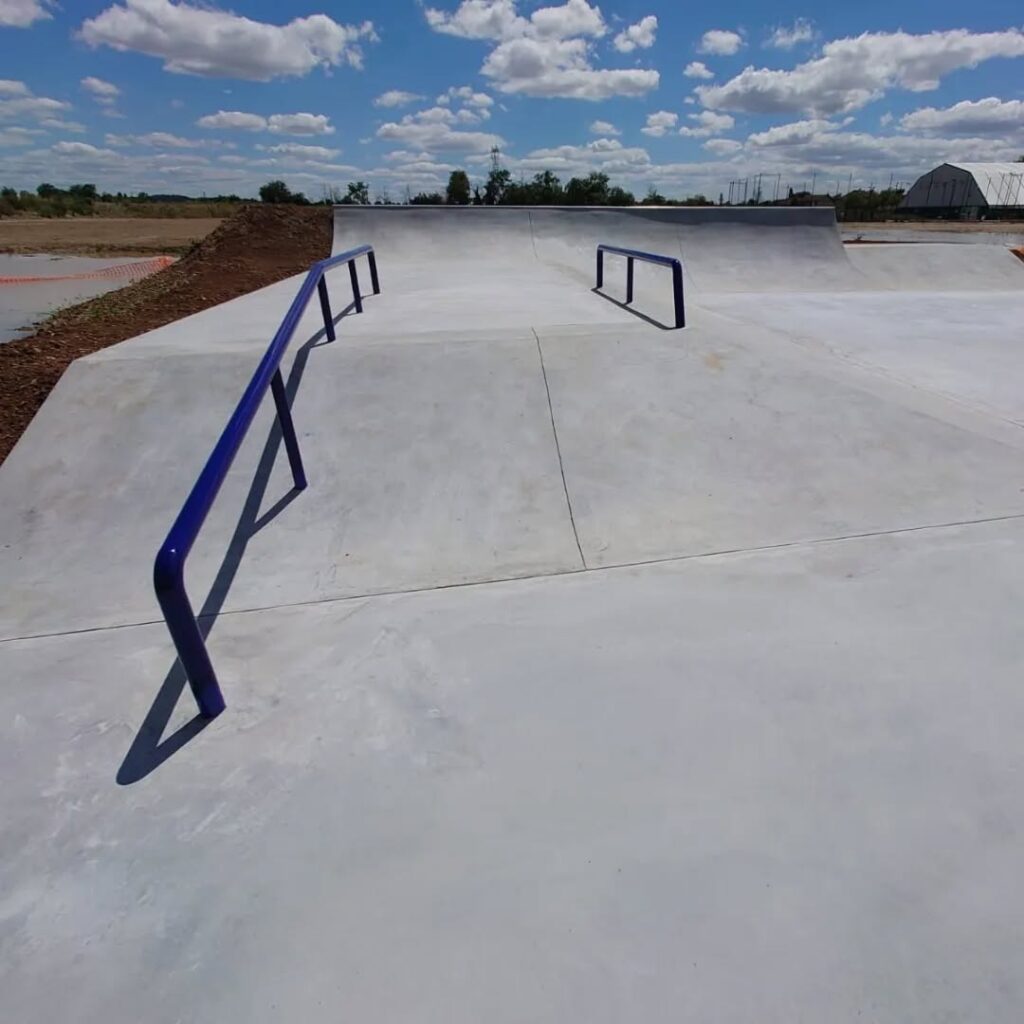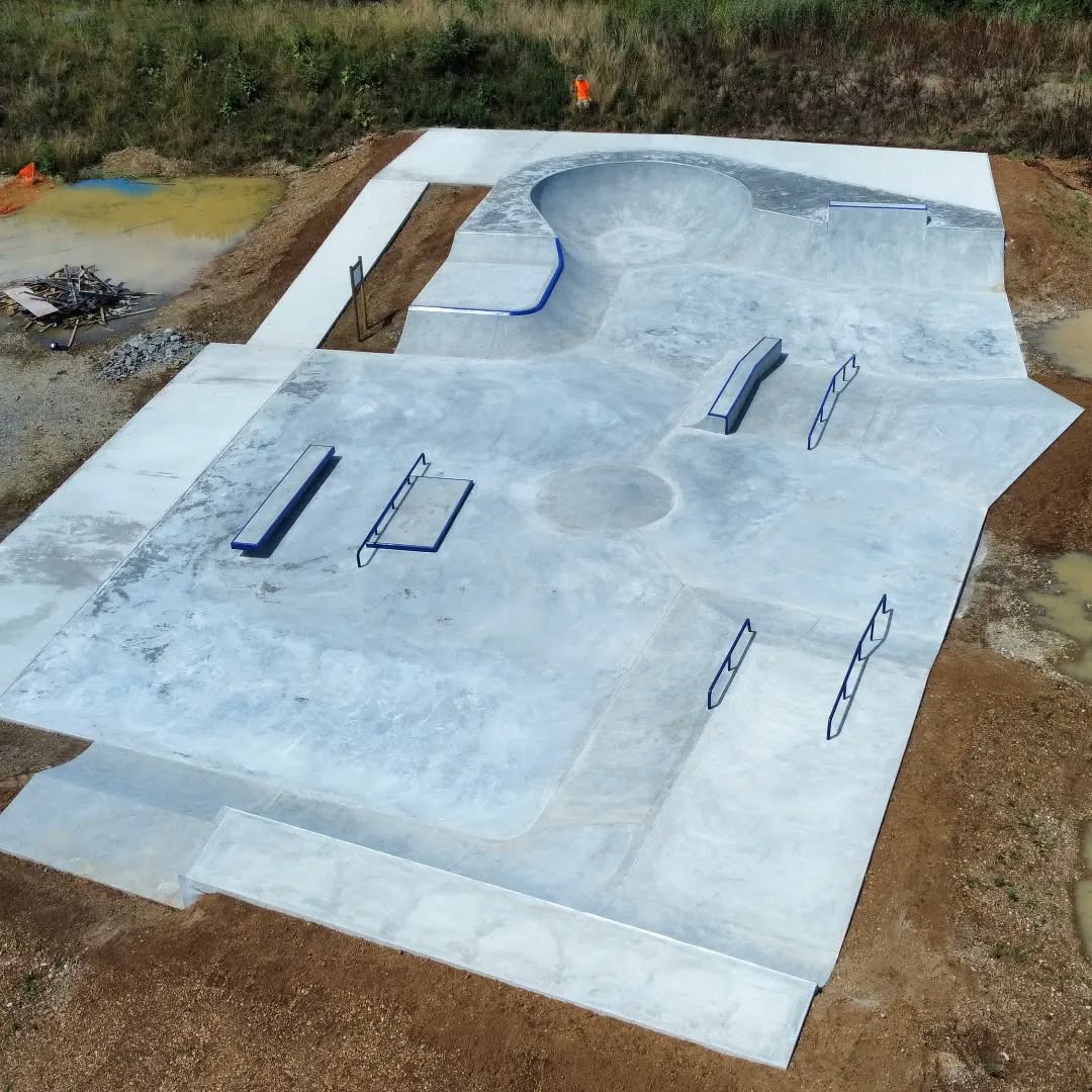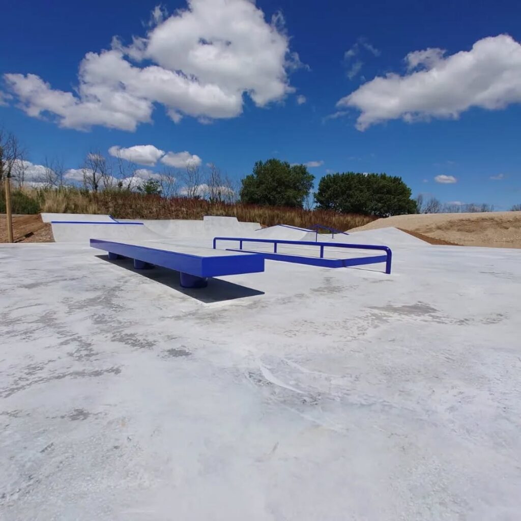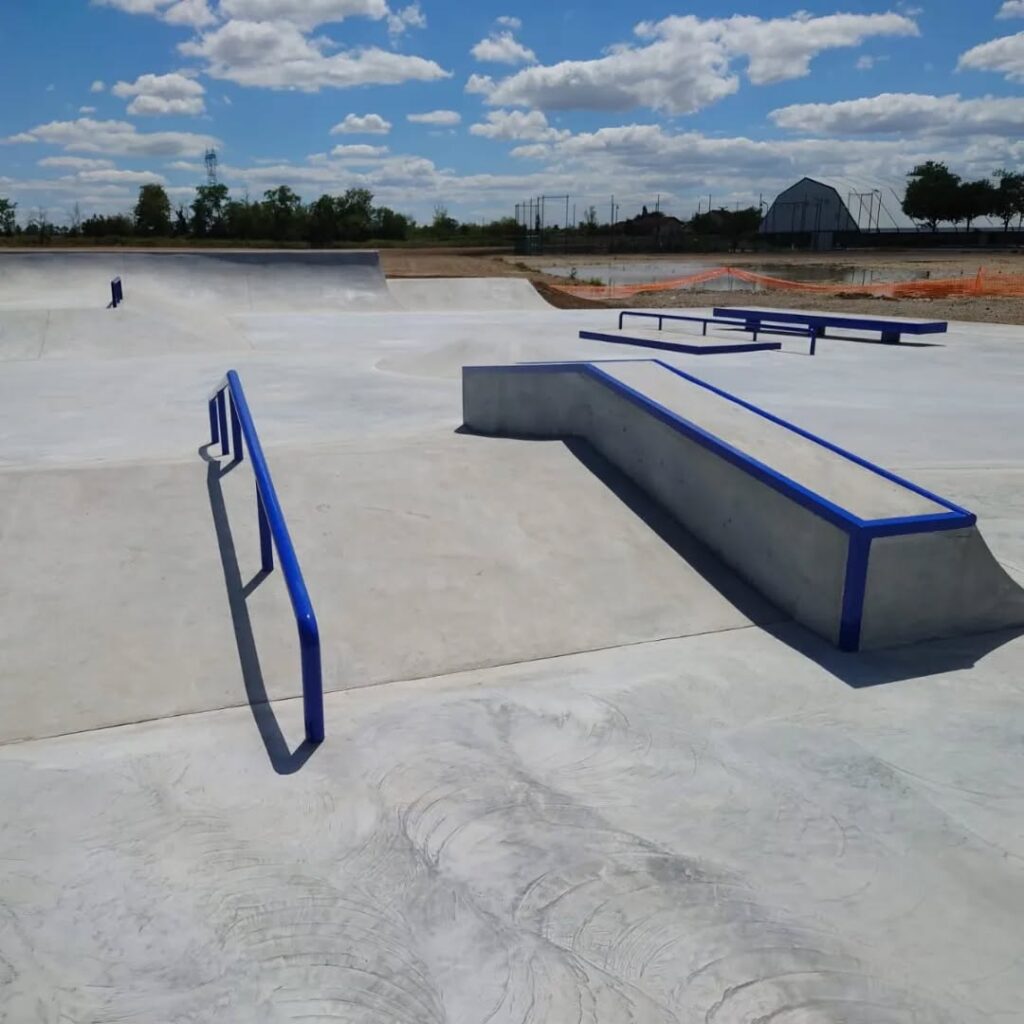 Le skatepark combine plusieurs types de modules et volumes de ride. Un demi-bowl avec une courbe de relance et copings en fer coexiste avec une zone street composée de kicker, funbox, bosses, rails, curbs, ledges et plans inclinés, offrant des options pour différents niveaux et approches du skateboard ou du BMX. La conception cherche à équilibrer des transitions fluides et des éléments de street plus dynamiques, tout en conservant une surface continue et adaptée à un usage public et fréquent.