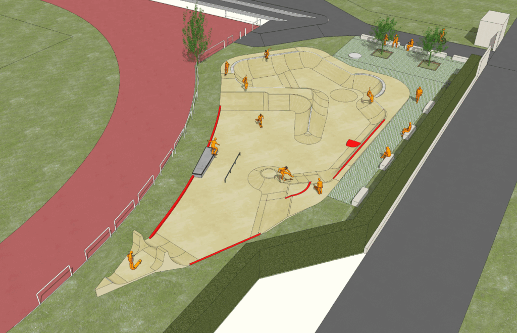 Le skatepark combine un bowl ouvert avec coping en dalle de piscine à l’américaine, des courbes fluides, des bosses en béton, des rails ainsi que des zones droites et inclinées permettant différentes approches de ride. Ces éléments sont intégrés dans une surface continue en béton lisse, conçue pour offrir une glisse régulière et une variété de lignes possibles selon le style de chacun.